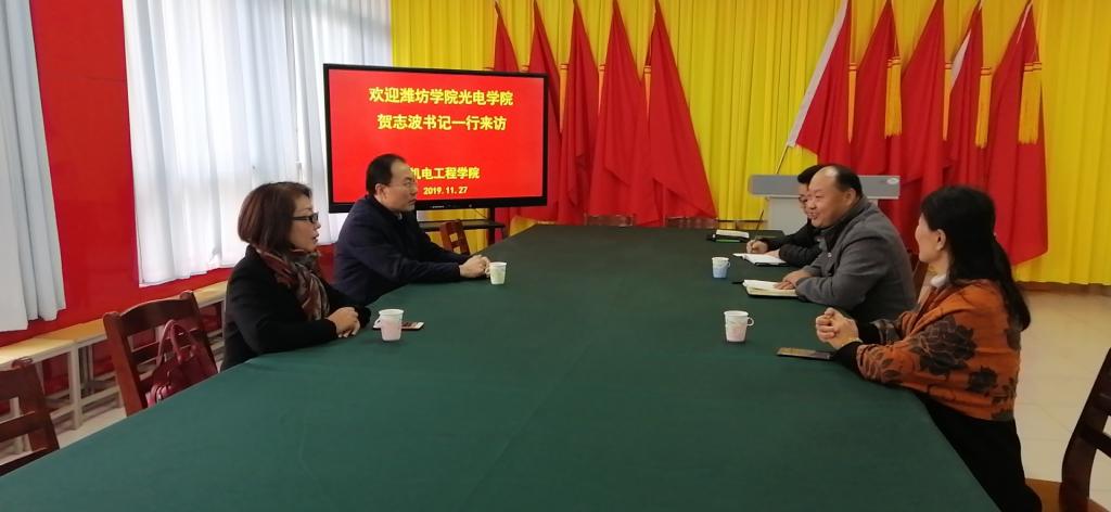 11月27日上午,潍坊学院物理与光电工程学院贺志波书记一行2人到太阳成集团tyc33455ccwww洽谈交流,太阳成集团tyc33455ccwww负责人及相关教师参加活动。