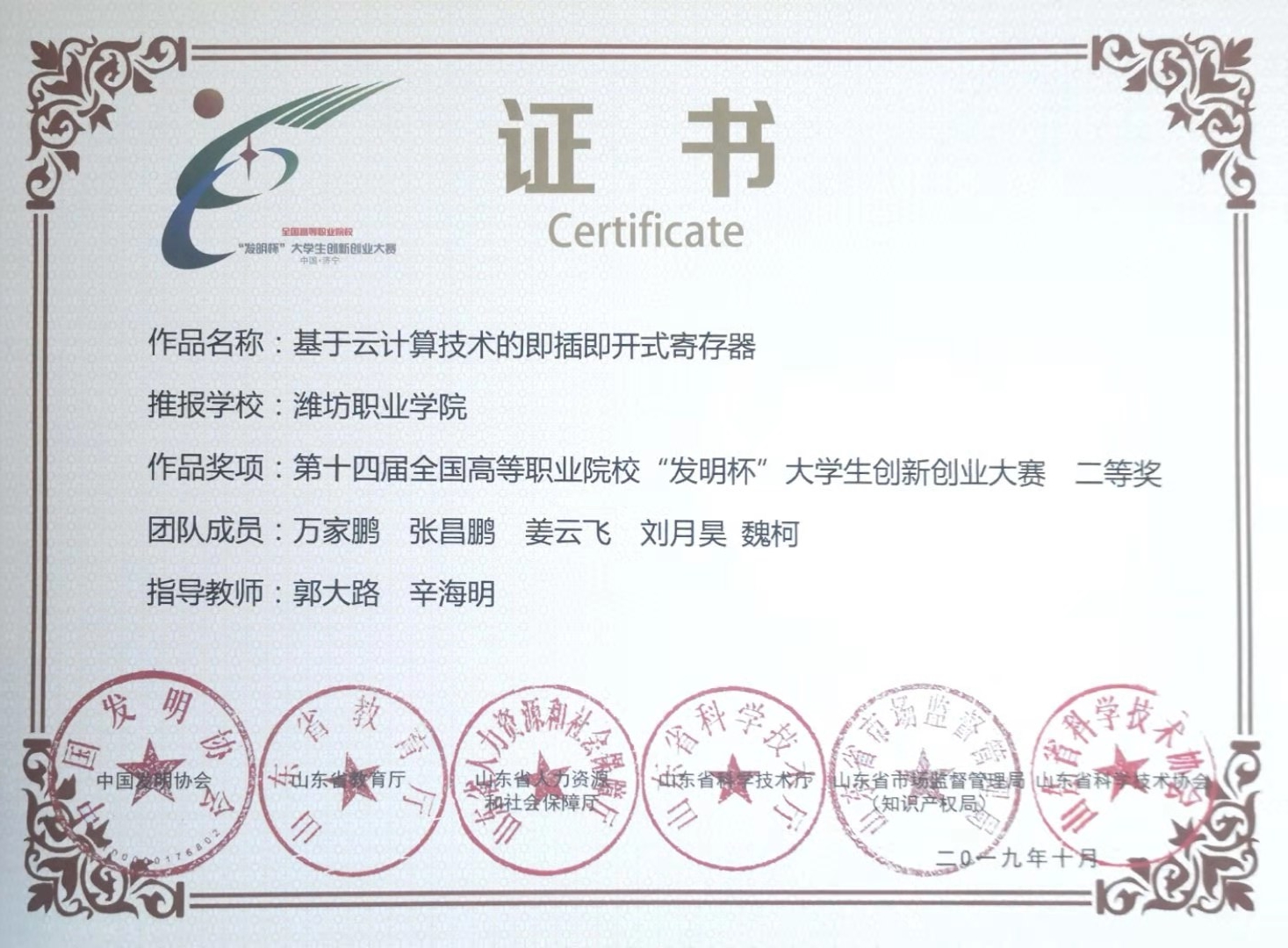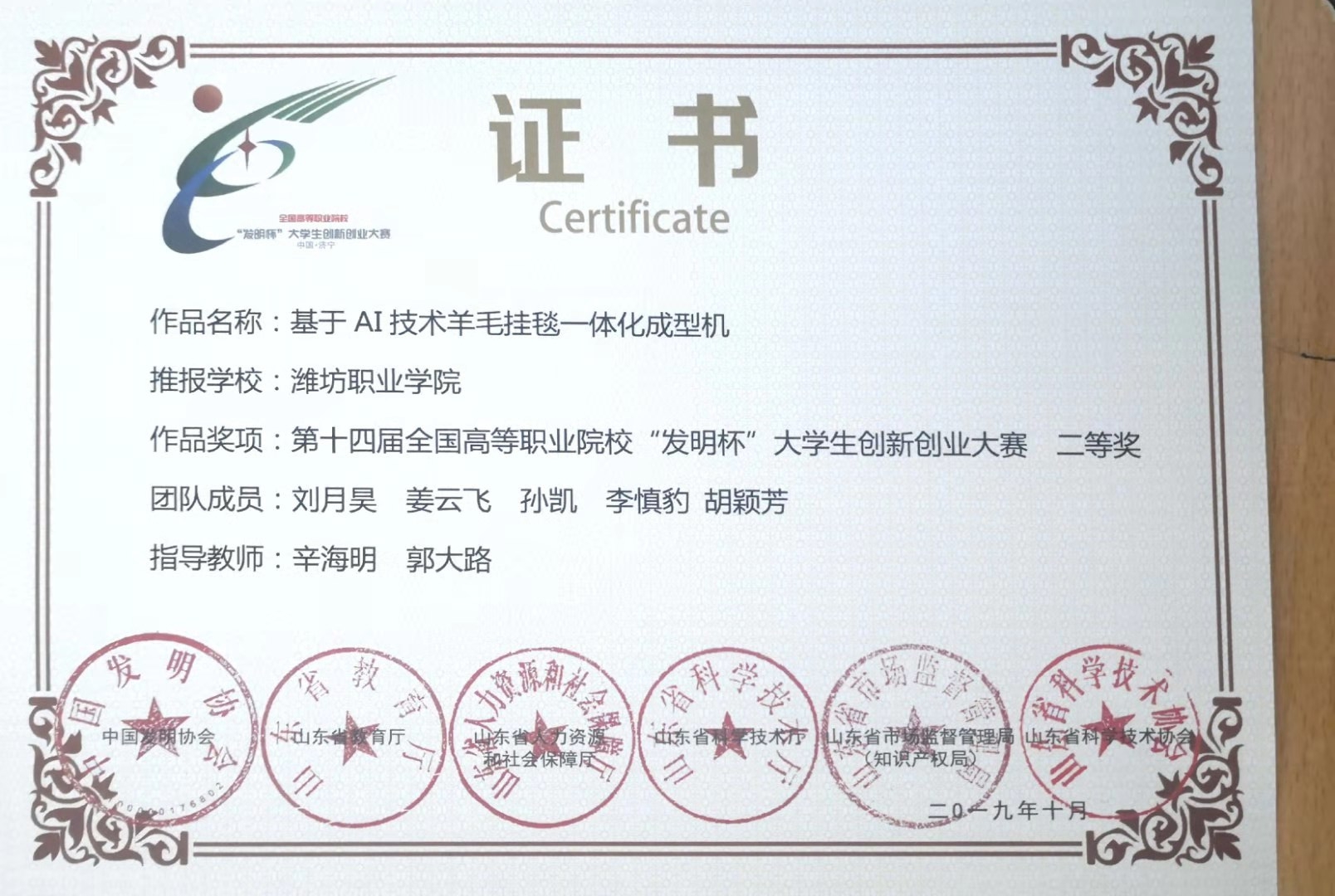本届老员工创新创业大赛由中国发明协会、山东省教育厅、山东省人力资源和保障厅、山东省科学技术厅、山东省市场监督管理局(知识产权局)、山东省科学技术协会主办。共吸引来自全国20个省132所高等职业院校代表队参加,共收到专利类、发明制作类、创业类、创意类比赛作品8264件,经过初评、复审晋级790件作品团队,决赛现场评审分为项目展示、专利成果、技术路线、专家终评等。机电工程公司郭大路、辛海明两位老师指导的《基于AI技术羊毛挂毯一体化成型技术》、《基于云计算技术的即插即开式寄存器》两个项目荣获两项发明制作类二等奖。(马珀供稿)