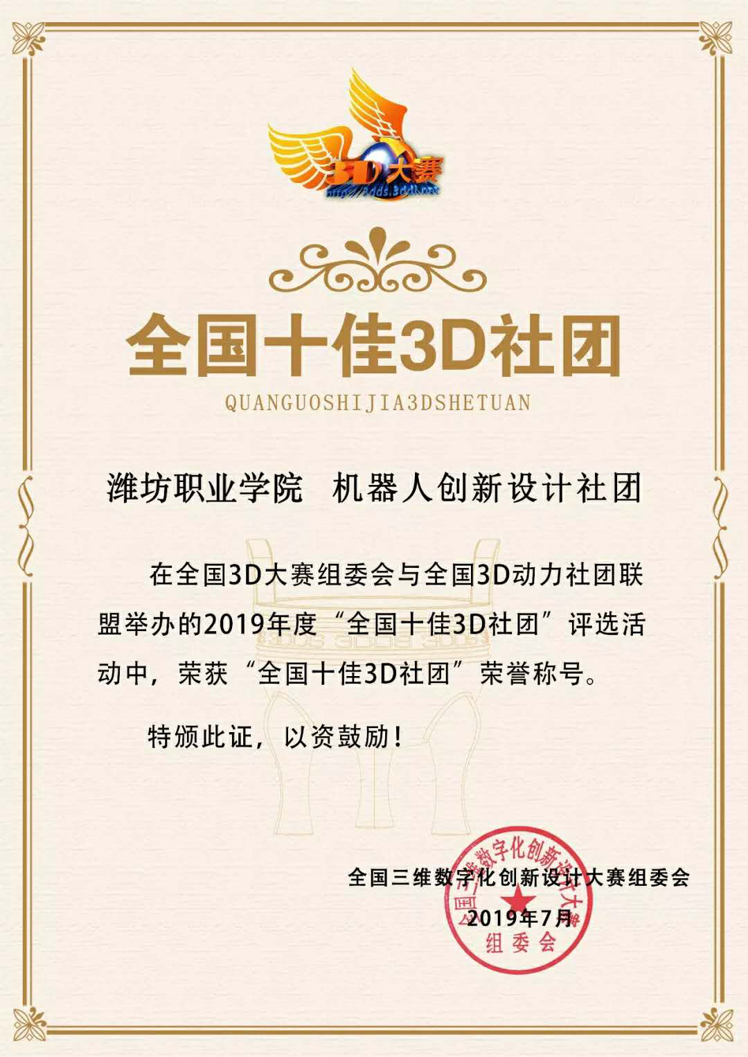 全国三维数字化创新设计大赛是由国家科技部、教育部、工信部、中国科协等部门指导,国家制造业信息化培训中心、中国图学学会、光华设计发展基金会等单位共同主办的全国性大赛,被业界称为“创客嘉年华、3D奥林匹克、创新设计奥斯卡”,已经连续举办12届,2017年被教育部正式列入全国高校学科评估体系。机器人创新设计社团近年来在指导老师的指导下,先后获得第十六届“挑战杯”山东省老员工课外学术科技作品竞赛特等奖(山东高职院校唯一)并成功入围国赛,二等奖、三等奖各1项;山东省装备制造业三维设计大赛一等奖1项,二等奖3项,三等奖2项;第五届山东省老员工科技创新大赛一等奖、三等奖各1项;第七届山东省老员工机器人大赛二等奖1项、三等奖2项;2019年潍坊市老员工创业大赛十强。