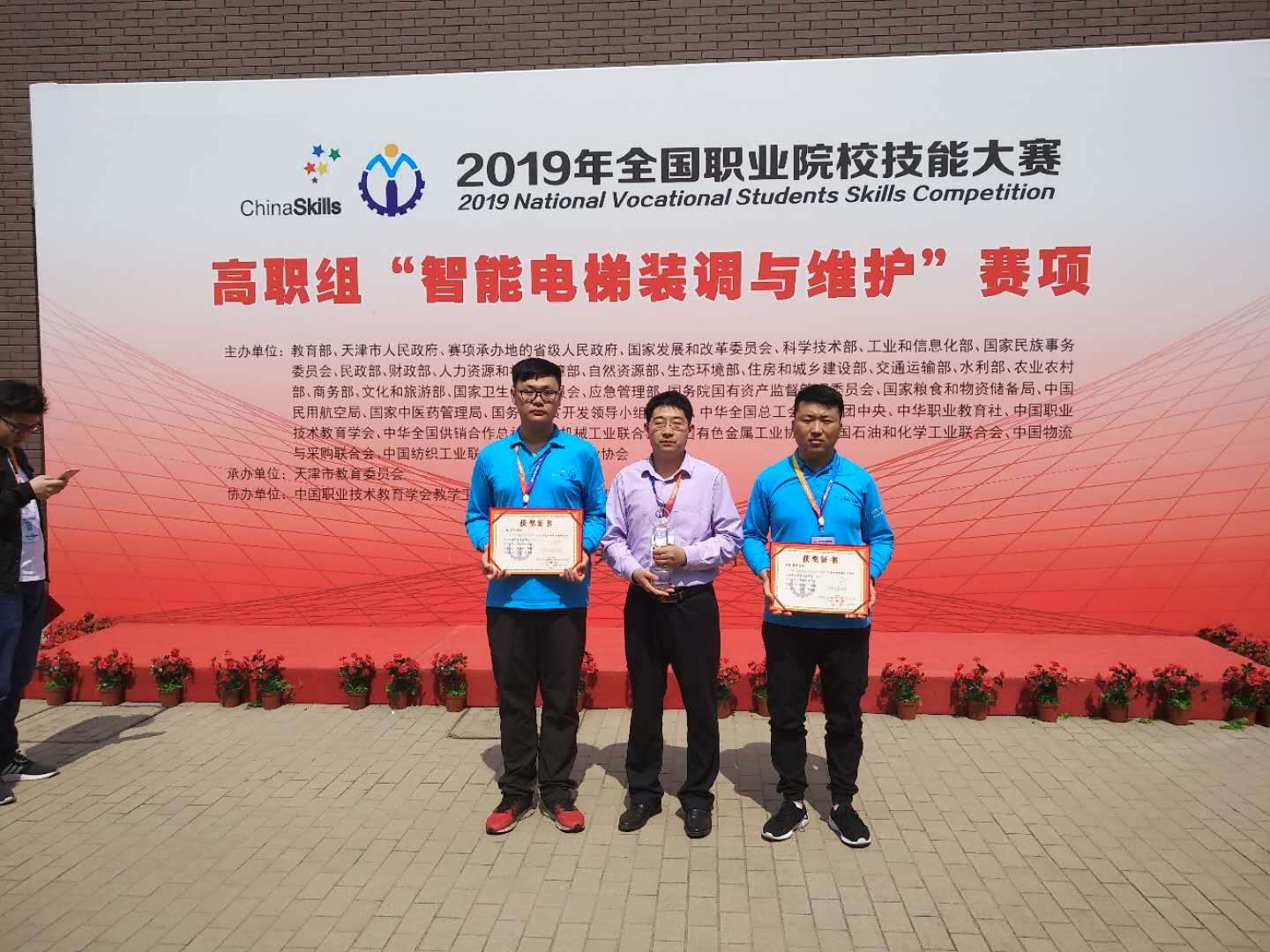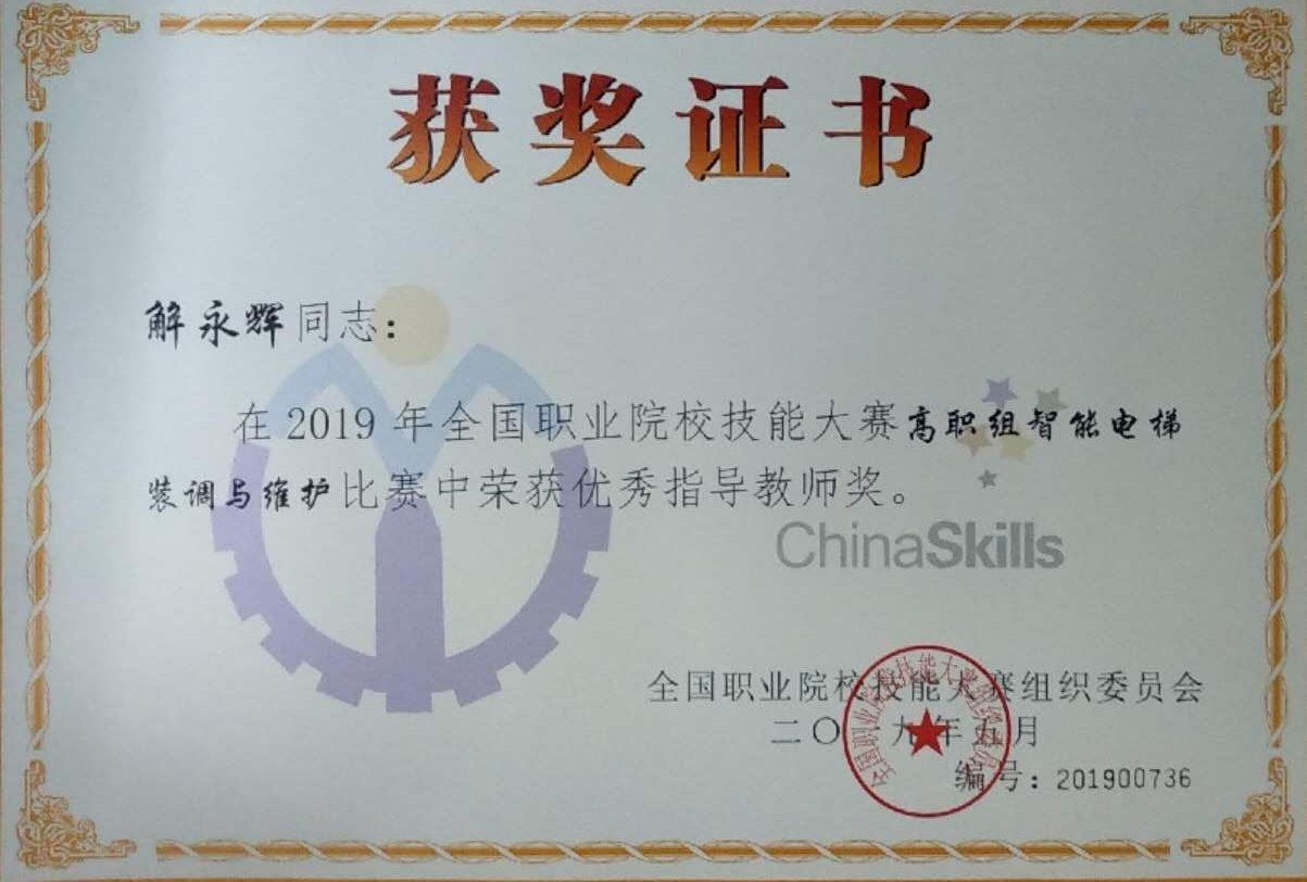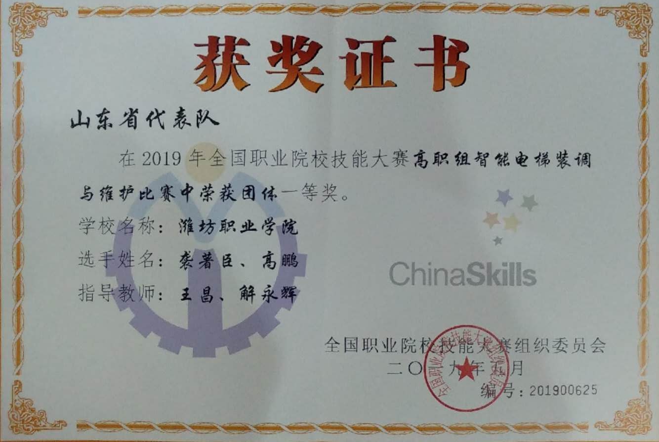 5月6日至8日,2019年全国职业院校技能大赛高职组“智能电梯装调与维护”赛项在天津轻工职业技术学院举行,来自全国的90支代表队参赛。太阳成集团tyc33455ccwww选派2017级电梯工程技术班员工袭著臣、高鹏,指导教师王昌、程义民、解永辉组成的山东三队参加比赛并获得团体一等奖,这是公司连续五届获得该赛项国赛一等奖。